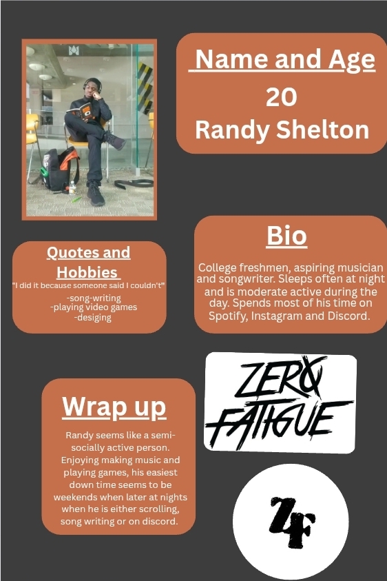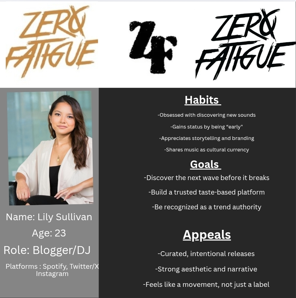 Lily is a blogger and a DJ, she prides herself in being early and music status is her currency. Being able to get in on the newest thing and catchy song is her niche. She’s known to be on Spotify, Twitter and Instagram to find the next new sound. She’d probably be on Spotify the most. Searching the app to find hidden treasure to sell her new discovery.